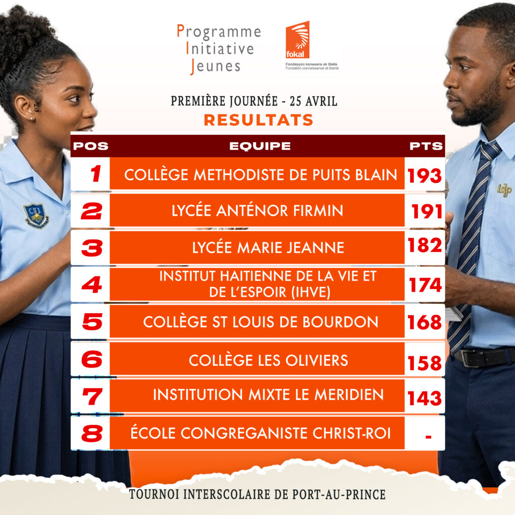 Au classement général de cette première journée, le Collège méthodiste de Puits Blain prend la tête avec 193 points, suivi de près par le Lycée Anténor Firmin (191 points) et le Lycée Marie-Jeanne (182 points). L’IHVE (174 points) et le Collège Saint-Louis de Bourdon (168 points) complètent le top 5. Du côté individuel, François J. Malbranche s’impose comme meilleur débatteur avec 71 points, devant Lovensky Archelus (66 points) et Olivier Henry (65 points), dans un classement très serré.